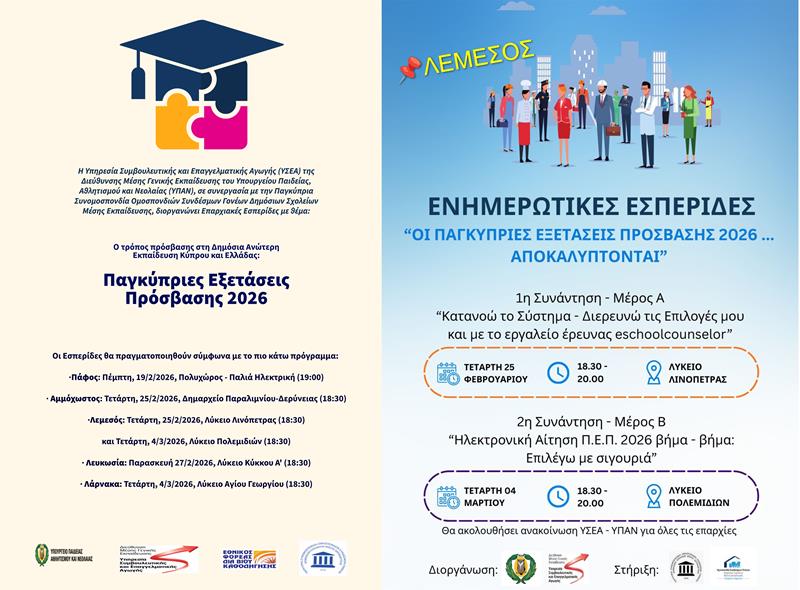 Θα θέλαμε να σας ενημερώσουμε ότι στο σχολείο μας λειτουργεί Γραφείο Συμβουλευτικής και Επαγγελματικής Αγωγής με τους ακόλουθους Καθηγητές ΣΕΑ: