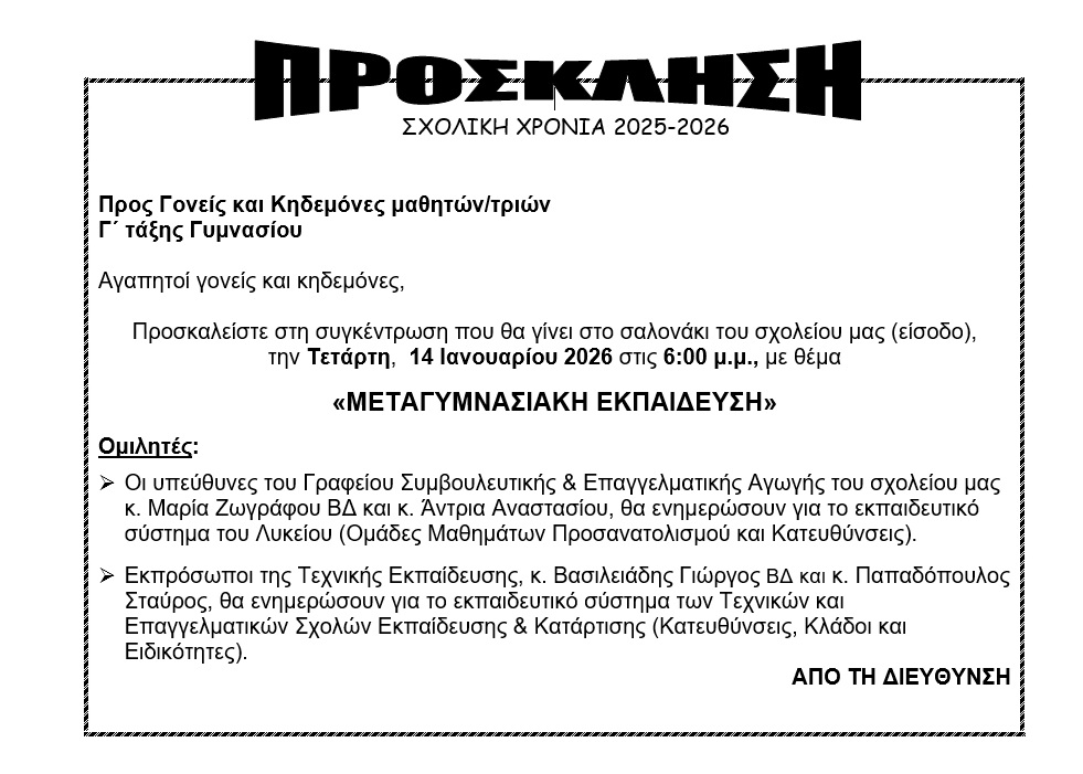 Eνημέρωση των μαθητών Α΄, Β΄ και Γ΄ τάξης Γυμνασιακού Κύκλου για τη δράση με τίτλο «Ημέρα Ανοικτού Σχολείου (OPEN DAY)» που διοργανώνει η ΔΜΤΕΕΚ σε όλες τις ΤΕΣΕΚ την 7η Φεβρουαρίου 2026