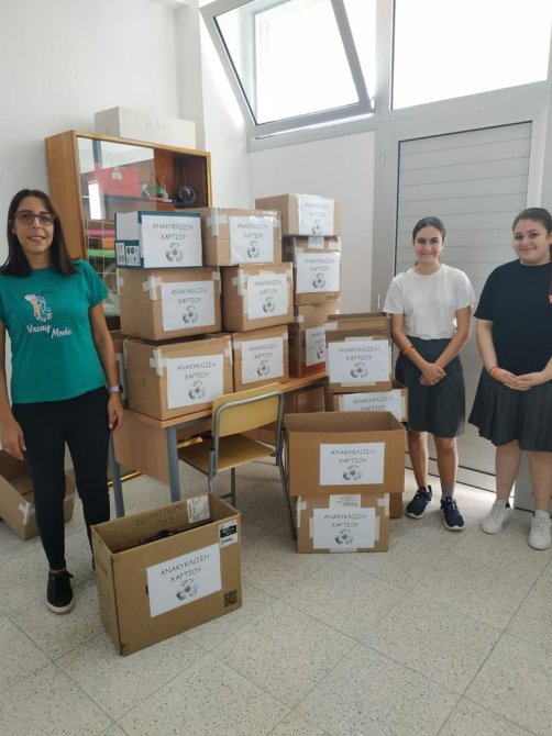 Στα πλαίσια του Προγράμματος «Οικολογικά Σχολεία» συμμετείχαν μαθητές του Σχολείου μας υπό την καθοδήγηση της συνοδού του σχολείου μας, Δημοσθένους Ιωάννα, μετατρέποντας χαρτόκουτες σε κάδους ανακύκλωσης χαρτιού και πλαστικού. Σκοπός της δράσης αυτής ήταν η αντικατάσταση των φθαρμένων κάδων με καινούριους. Οι νέοι κάδοι μεταφέρθηκαν και τοποθετήθηκαν στις αίθουσες διδασκαλίας από τους μαθητές, Κωνσταντίνου Κωνσταντίνο (Α’4), Χατζηγιάννη Αντρέα (Α’4) και Στυλλή Χρίστο (Β’5).